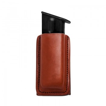 This single magazine holster features quality leather and expert stitching for a snug, secure fit. Simple, reliable open top design for easy, trouble-free in/out access. Vertical carry. Comfortable carrying, close to the body. Wrap-around design that snaps to your belt. Fits belts up to 2 ¼” wide, through belt slots. Fits most 9 mm and .45 magazines. AMBIDEXTROUS