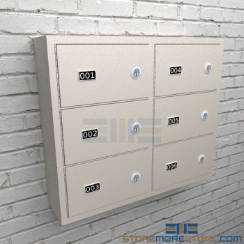 SIX COMPARTMENT SURFACE WALL MOUNT HAND GUN LOCKERS WITH MASTER KEY LOCKS, 25″ WIDE X 6-1/2″ DEEP X 20-1/8″ HIGH