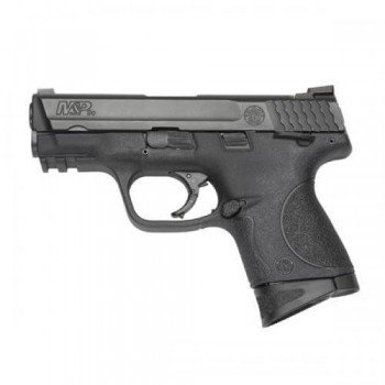 The Smith & Wesson M&P9C .9mm Pistol features a stainless-steel chassis and a melonite-coated slide and barrel and offers semiautomatic double action with a 12+1-round capacity. This compact, lightweight pistol also features a steel, white-dot, dovetail-mount sight, a steel, white-dot, dovetail-mount low rear sight, a hinged trigger design and drop and striker safeties.